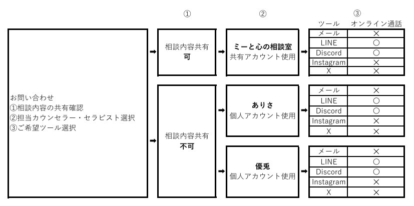 ・相談内容の共有を不可とした場合は、改めて担当カウンセラー・セラピストより個人アカウントをお知らせしますので、そちらをご利用ください。